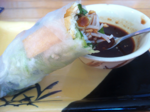 Nun befinde ich mich im Urlaub auf Fehmarn, die kleine Insel oben im Osten. Hier fällt es noch schwerer vegan zu leben. Fischbrötchen, Fischplatten, Krabbensüppchen und sonst wenig anderes steht in den Restaurants auf dem Speiseplan. Hm, da bleibt nur selbst kochen und deshalb haben wir ein Studio mit Kochgelegenheit gemietet. Leider … sind wir die meiste Zeit unterwegs und anschließend schwimmen und saunieren. Kochen war ein feiner Plan, fällt aber mangels Tagespensum meist flach. Gut, dass es wenigstens einen Asiaten im nahen Ort gibt. Der bietet vietnamesische Frühlingsrollen in Reispapier an (obwohl die sind im Kölner Cyclo besser – das Bild unten ist aus Köln). Wer sie das erste Mal ist, wird erstaunt sein. Kalter Genuss ist angesagt. Dazu eine Soja- oder eine Erdnusssoße. Lecker.
